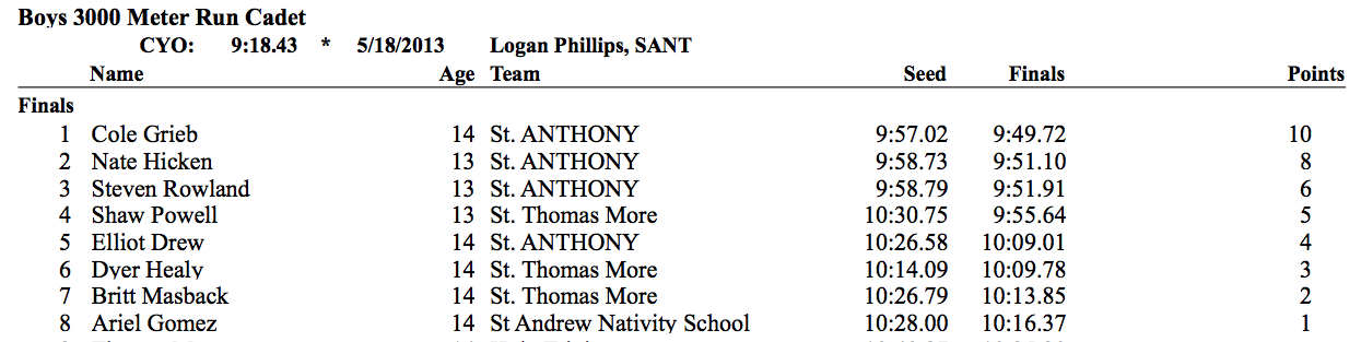 Cole Grieb, CYO Meet of Champions winner in the 3000 Cadet Boys 2015