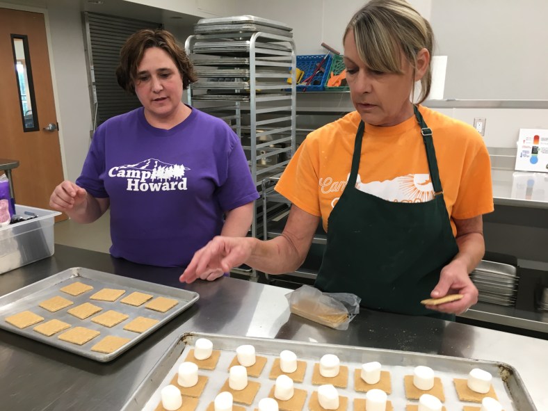Below: Shawna King and Melanie Smith ( two of the fantastic cooks at Camp Howard) put half a graham cracker on a sheet pan then put a marshmallow on top of each cracker.