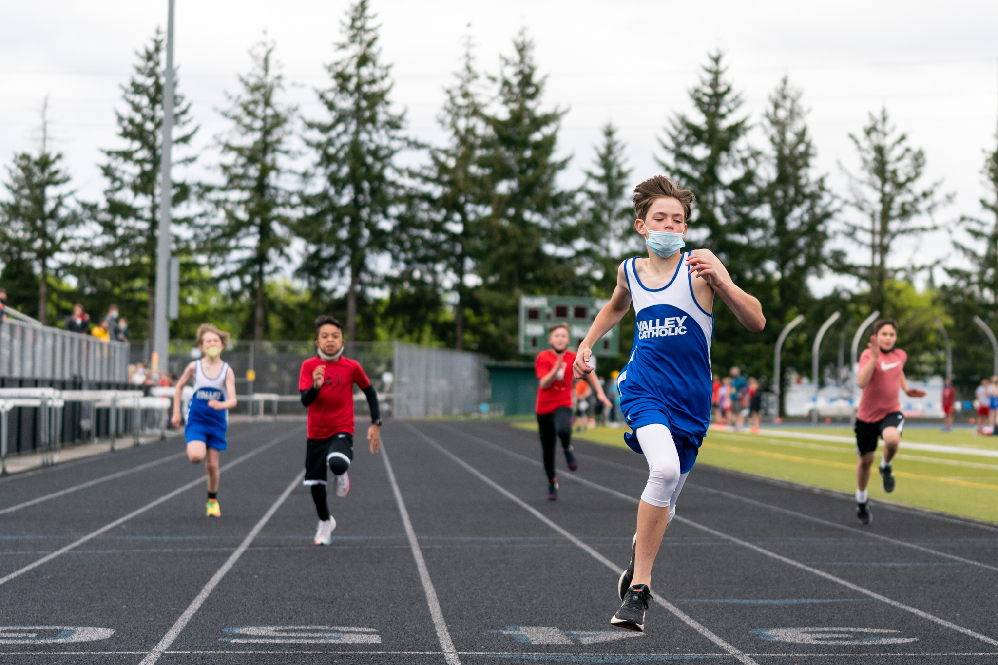 Sam Robbins wins his heat of the 100 meter dash at the CYO mini meet at Valley Catholic May 1, 2021. He also took first place overall in the longjump for his age group.
