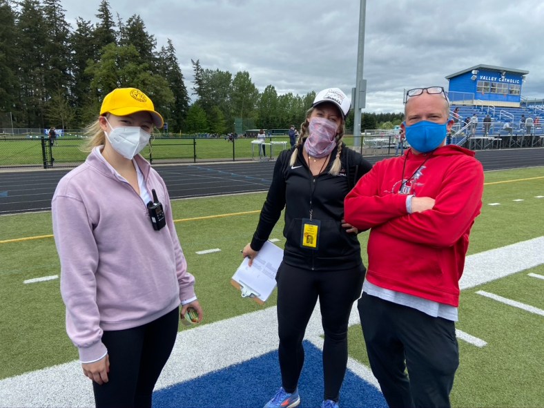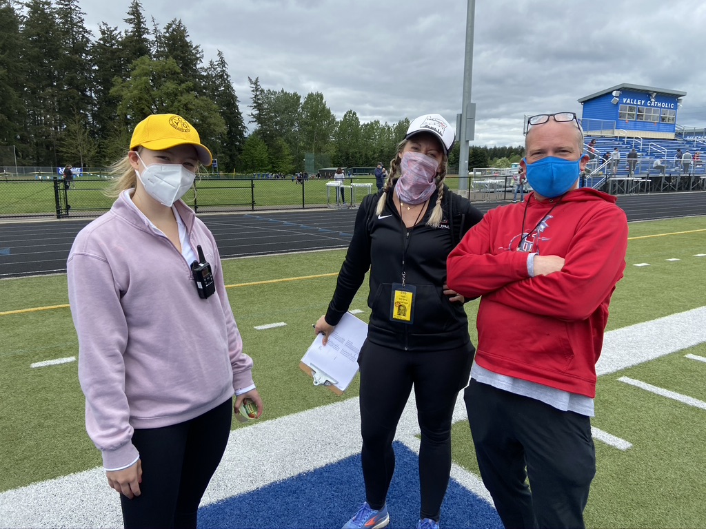 Paige Dunckley, CYO Meet Director talks to head track and field coaches, Liz Dooley (West Hills Christian) and Isaac Forquer (Holy Trinity) prior to the beginning of the meet. Liz and Isaac are also two of the five CYO Track and Field Commission Members.