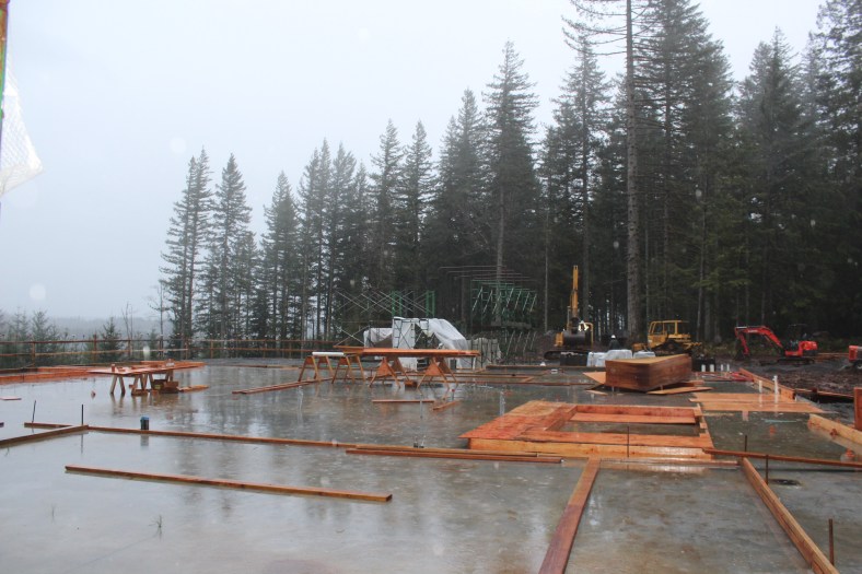 Below: Three quarter view from the new access road gives a wonderful perspective of the building. The large rocks will be removed and used in the Sandy River for stream bed restoration. The area will be cleaned and dressed then planted to lawn. It will serve as a welcoming green space and a fire defense area.