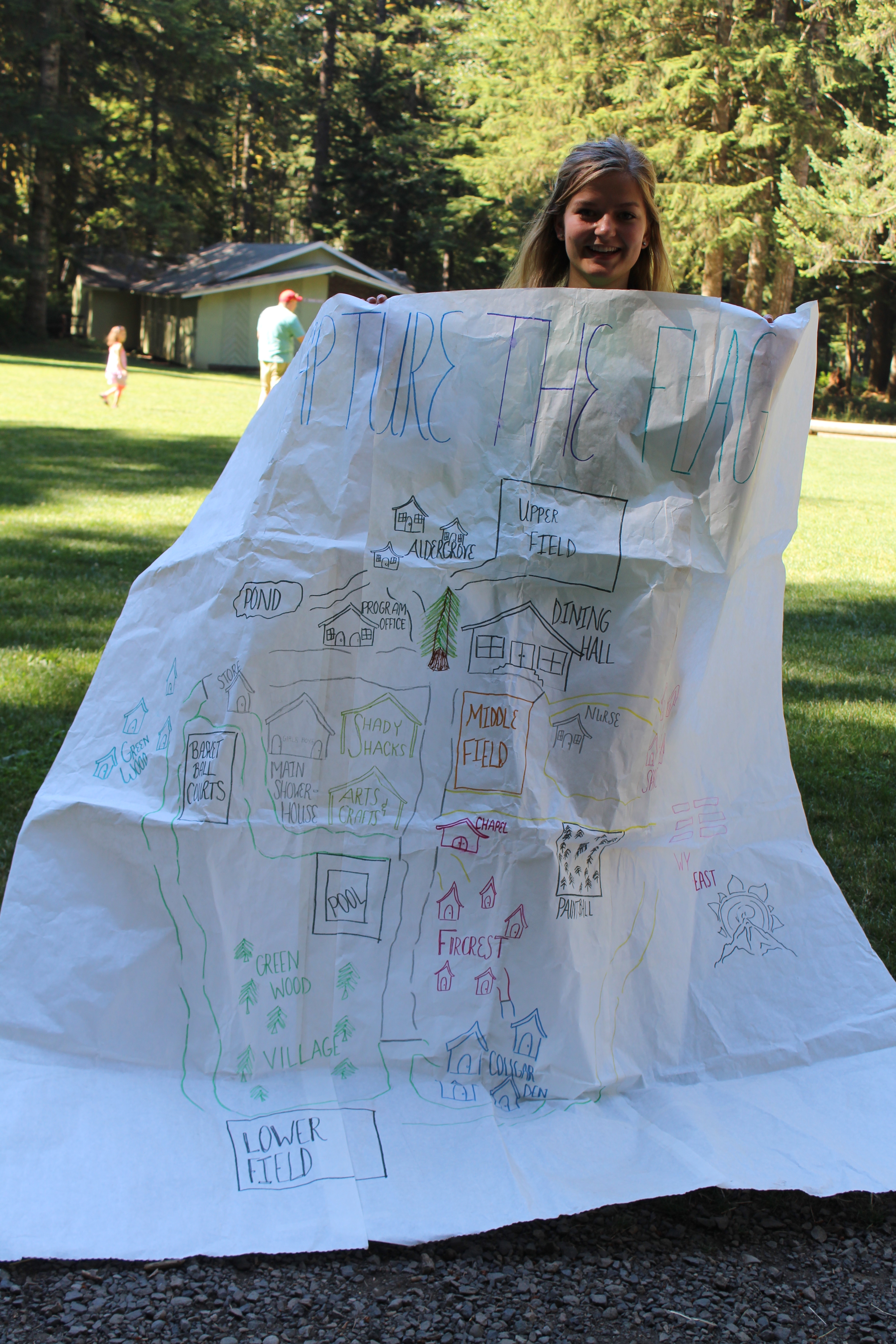 CAPTURE THE FLAG…we could not operate the camp without it…there would be mutiny!!! Capture the Flag is an all camp event that takes place at the end of the week and all of the camp participates. Kids LOVE it! Khaki Anderson shows a map she drew of the camp to assist in explaining the rules of the game to the kids. Khaki is the Program Director for Camp Howard this summer and has done a first class job in the role.