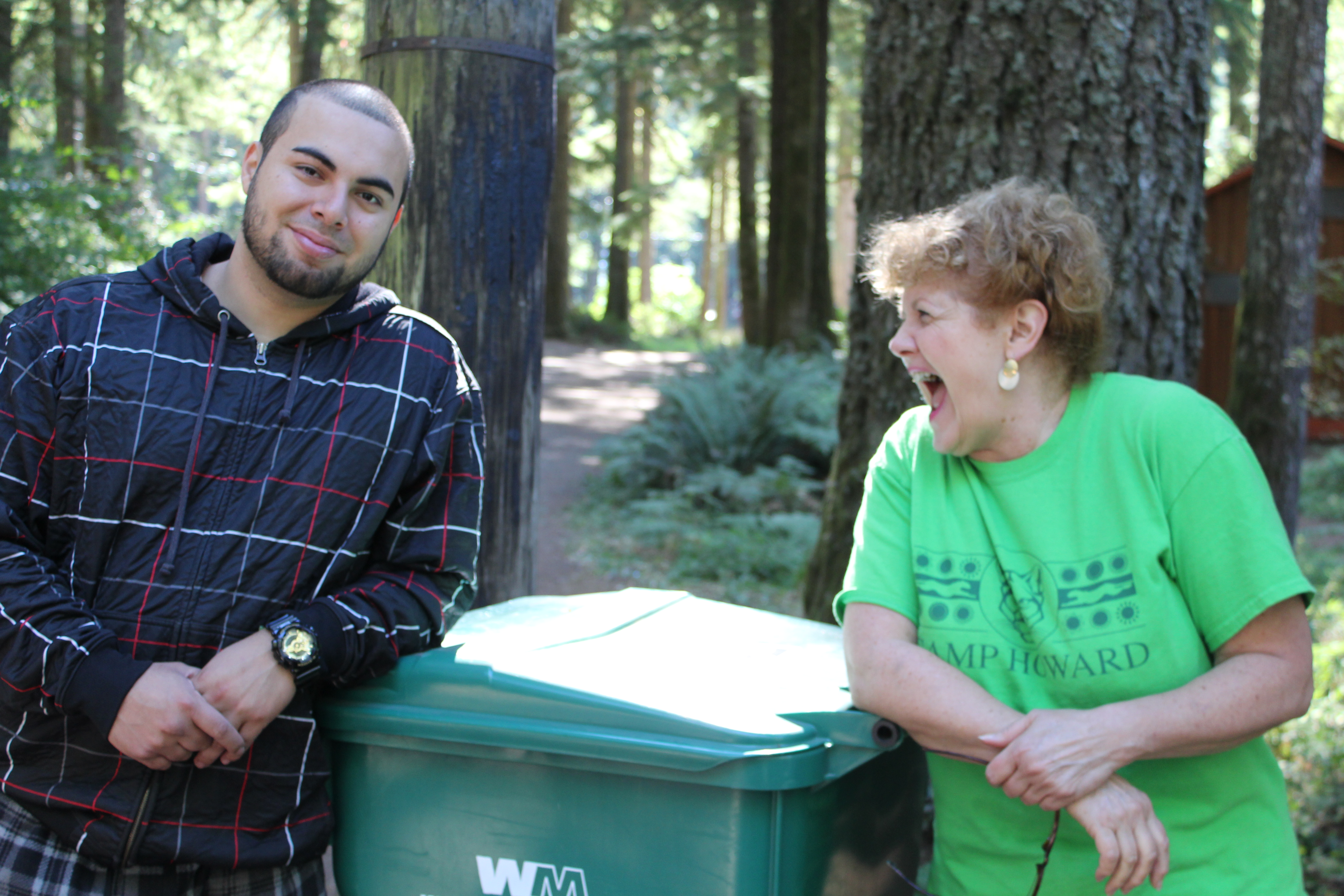 Health and Safety Director, Leila Blakely and her very helpful assistant, Eddy Reyes have contributed greatly to the cleanliness of camp, safety in food service, hydration stations around camp and pool safety. Their daily routines include making sure all of the camp is recycling and composting which includes all of the food at the dining hall. They gather all of the garbage bins and reline them. They clean all of the mops in camp keeping them ready for use. They are in charge of health and safety for food service outside of the dining hall including barbecues and groups that eat outside on the lawn or under the barbecue tents. This means they deliver the food to the service area and make sure everyone helping with food service is doing it properly all the way down to wearing food service gloves.