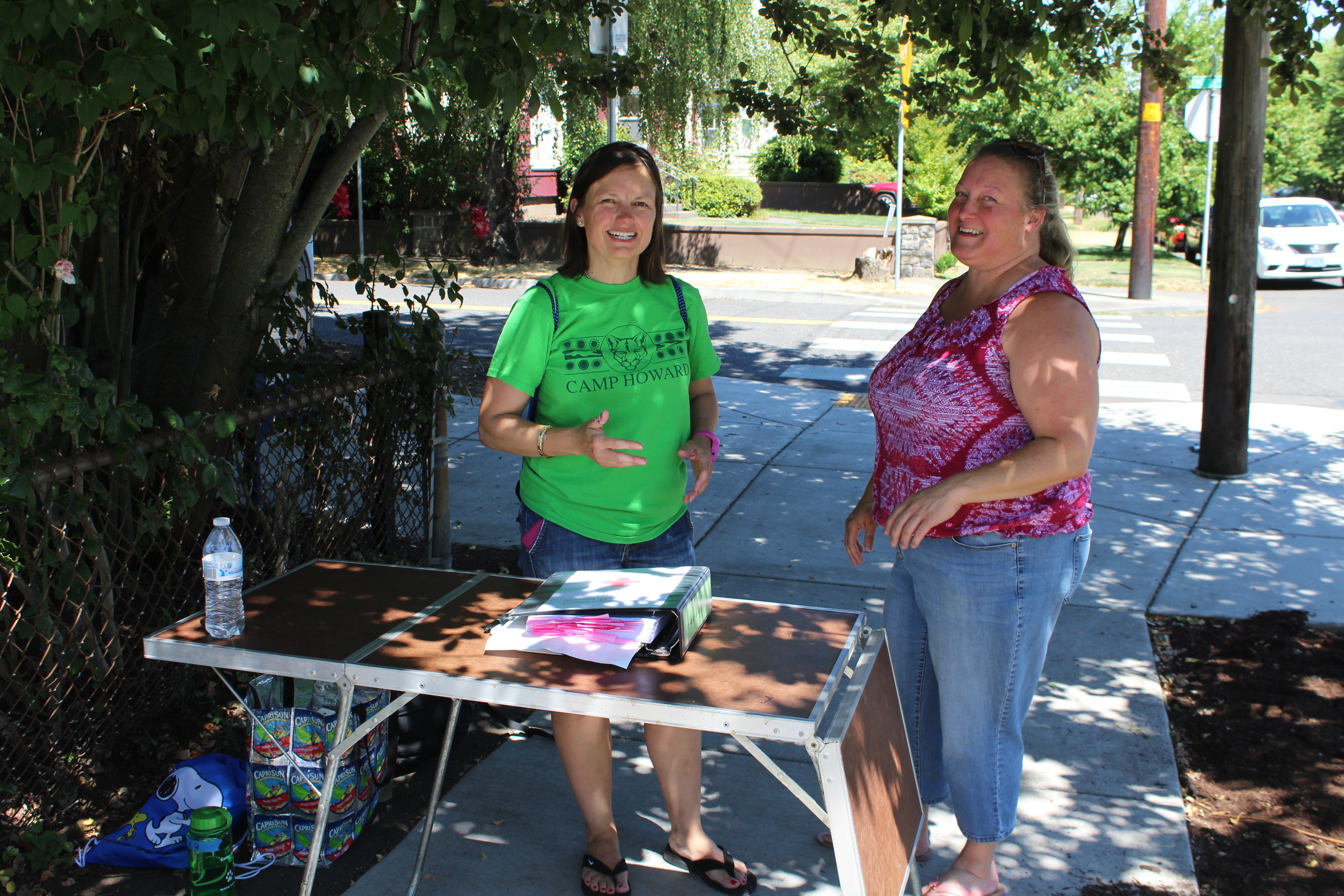 Nurse Cindy and Camp Registrar, Nora, chat at the bus stop