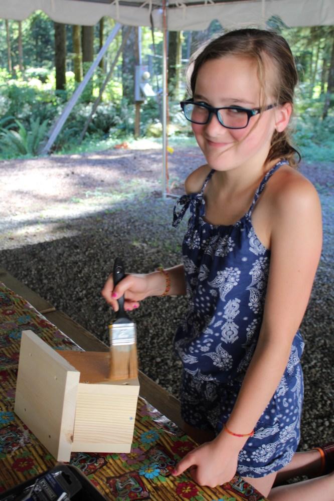 One of the new additions to the line up of activities was bird house construction Session 6 at Camp Howard. The bird houses were pre-cut out of 3/4″ pine in a traditional slant box pattern with bevels at the camp. Campers assembled the houses with screws and glue then painted them in the color scheme of the original cabins at Camp Howard. The Fircrest Unit of cabins was the original unit with 6 cabins. The board and bat buildings are painted in a rust red paint with burnt orange trim. All of the original buildings at the camp are painted in that color scheme.