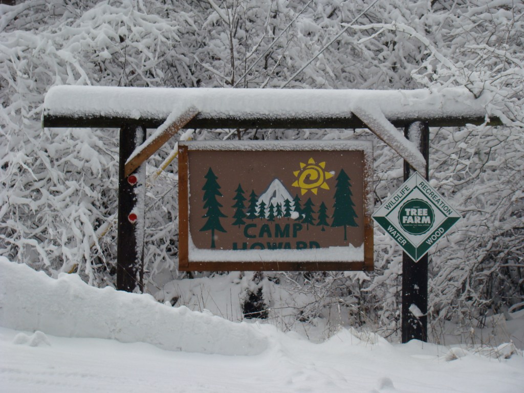 The Camp Howard sign welcomes in spite of the 36″ of snow winter 2009.