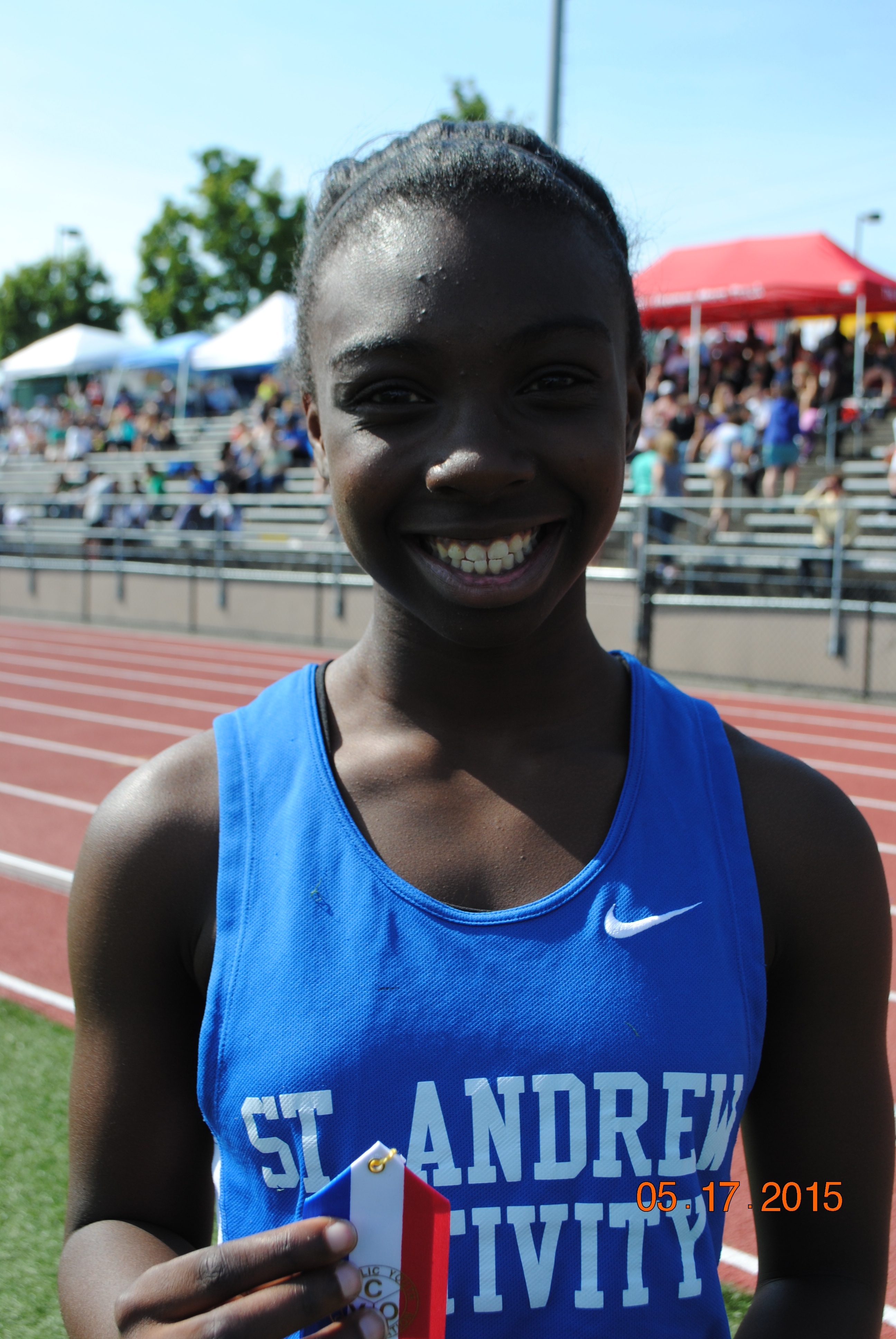 Keziah Hollands from St. Andrew Nativity School put 10 points on the board for her team with her victory in the Cub Girls 200 meter dash at the CYO Meet of Champions May 17, 2015.  She was a lot of fun to watch as she powered half way around the track to claim her prize.  Congratulations Keziah!