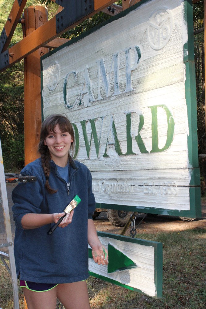 Cheyenne Cunning, you may know her as the “Camp Store Lady” as she has operated the Camp Store the past three years and grown up doing various jobs at the camp. She has always had an artistic knack, actually a very talented artist. I asked her to bring the Camp Howard sign back to life after about 6 years of weather wear and abuse. She took on the project and made it happen just in time to beat the rains! Thank you so much, Cheyenne, for the great job you did on the sign! It is a very beautiful welcome to the camp again!