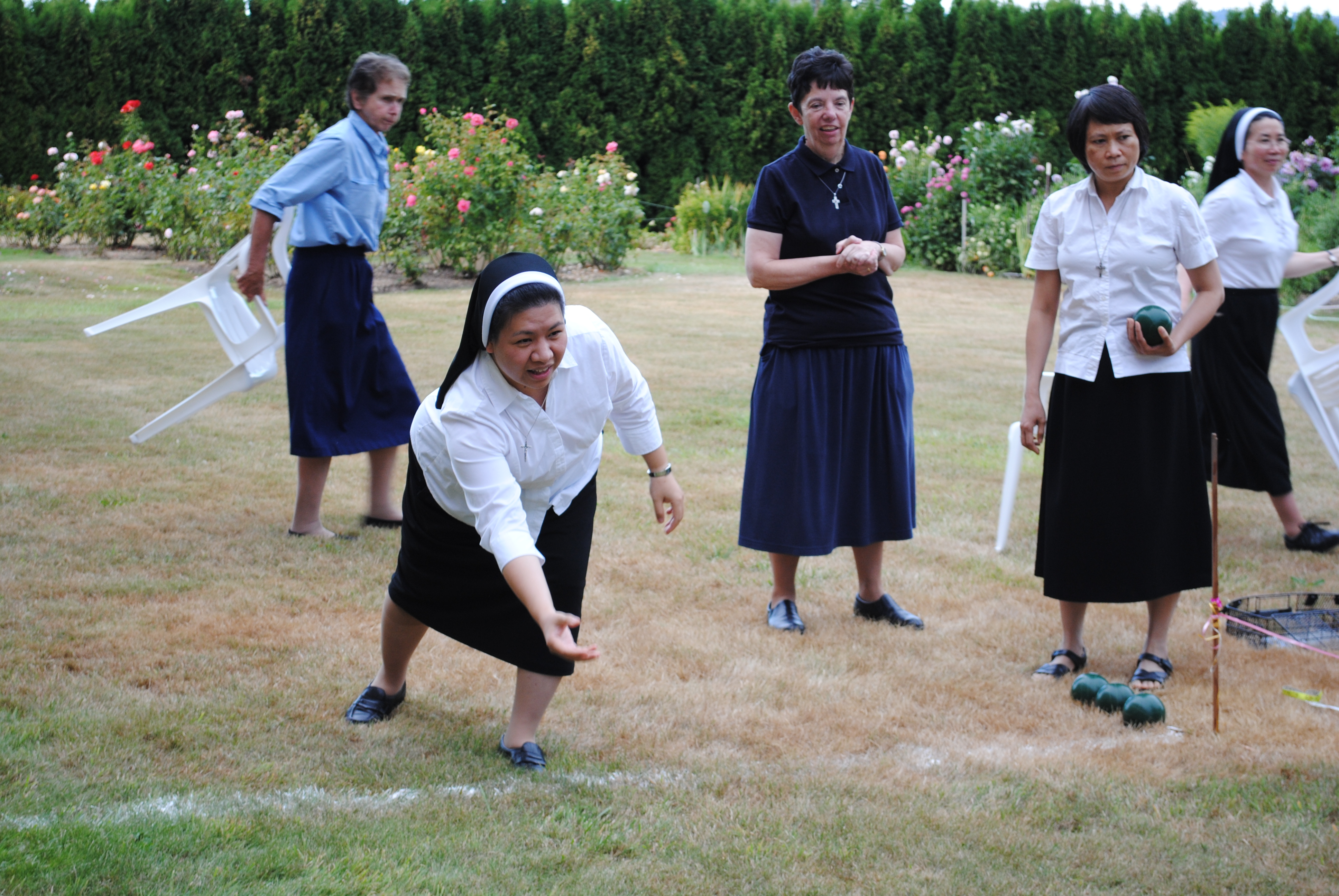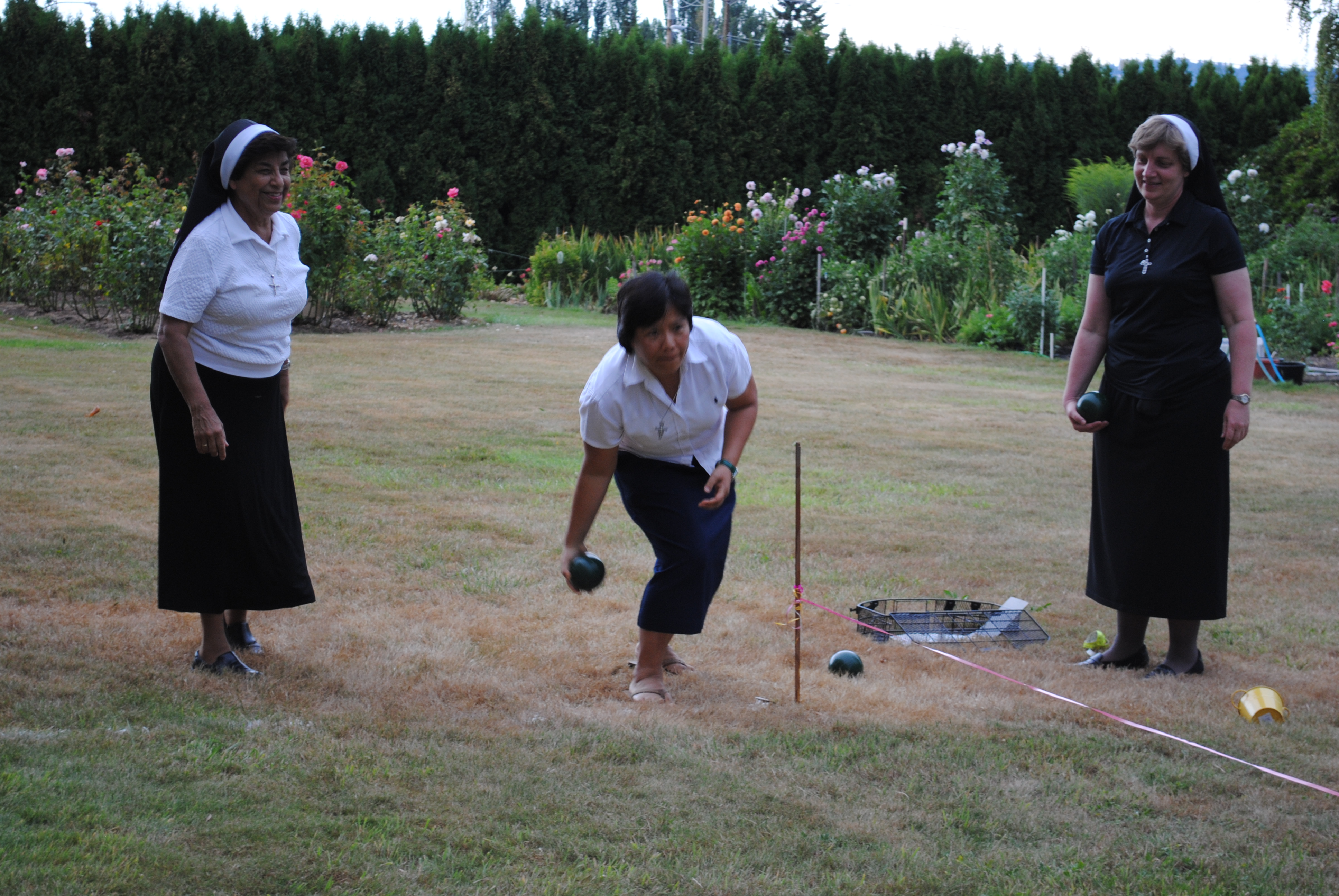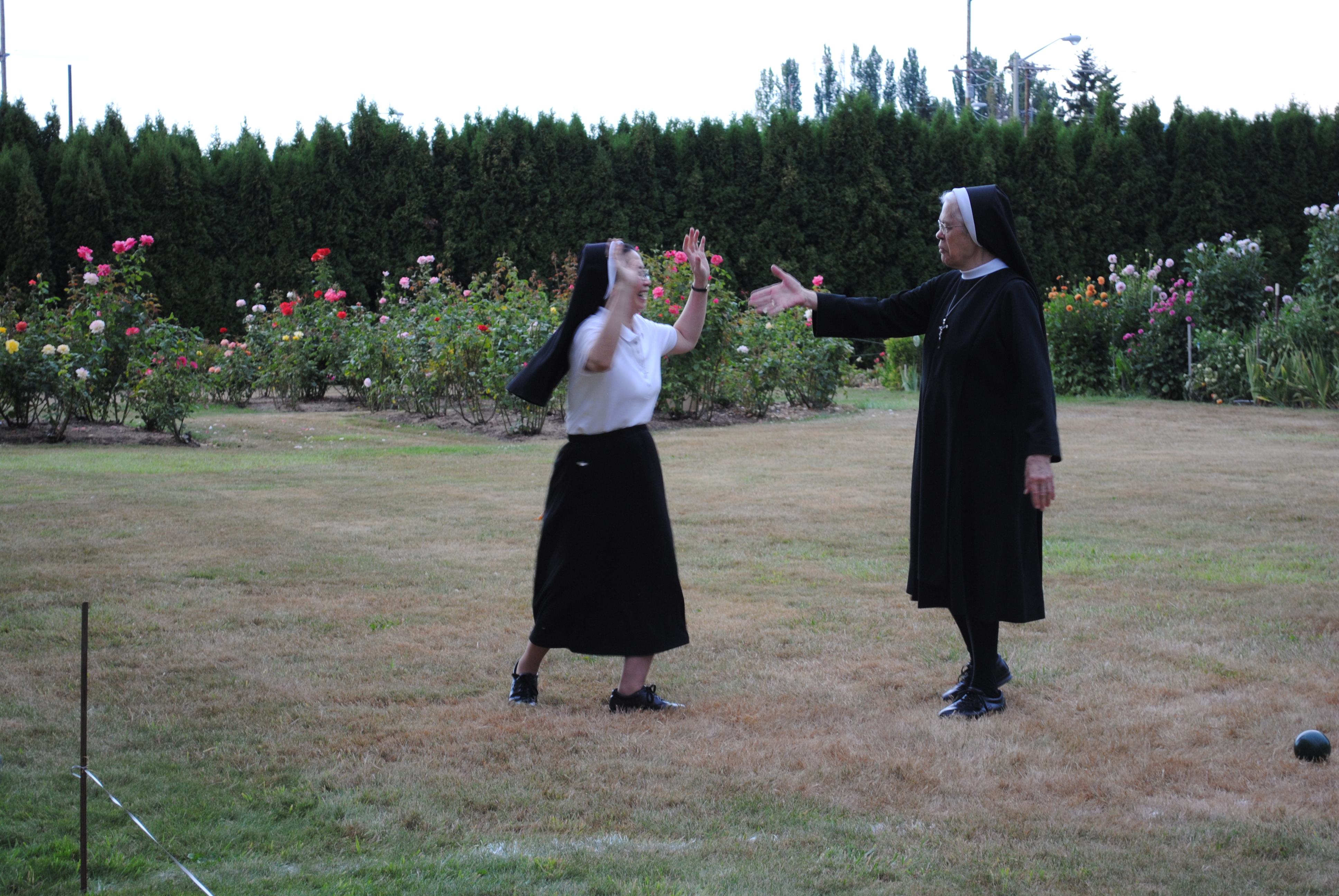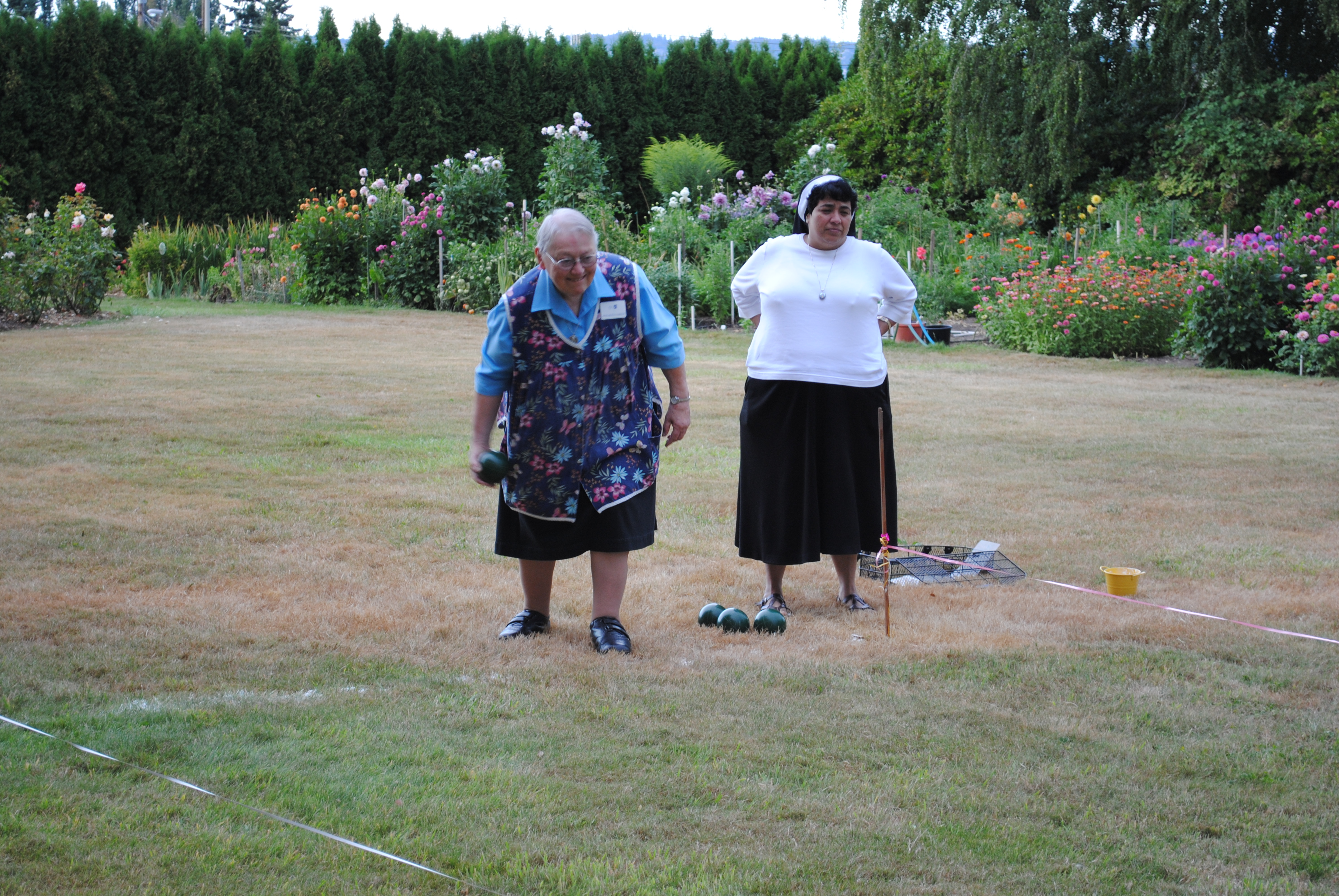 The Sisters of St. Mary of Oregon, at their annual “Community Days” took time out to compete in the Bocce Ball Tournament. Interestingly, this game was once the most popular game in the world! The basic aim of the game is to get your ball closest to the “jack” at the end of four balls per team. The game drew 18 contestants this year and a huge gallery of spectators! The champions, at the end of the double elimination tournament were Sister Juanita Villareal and Sister Michael Francine.