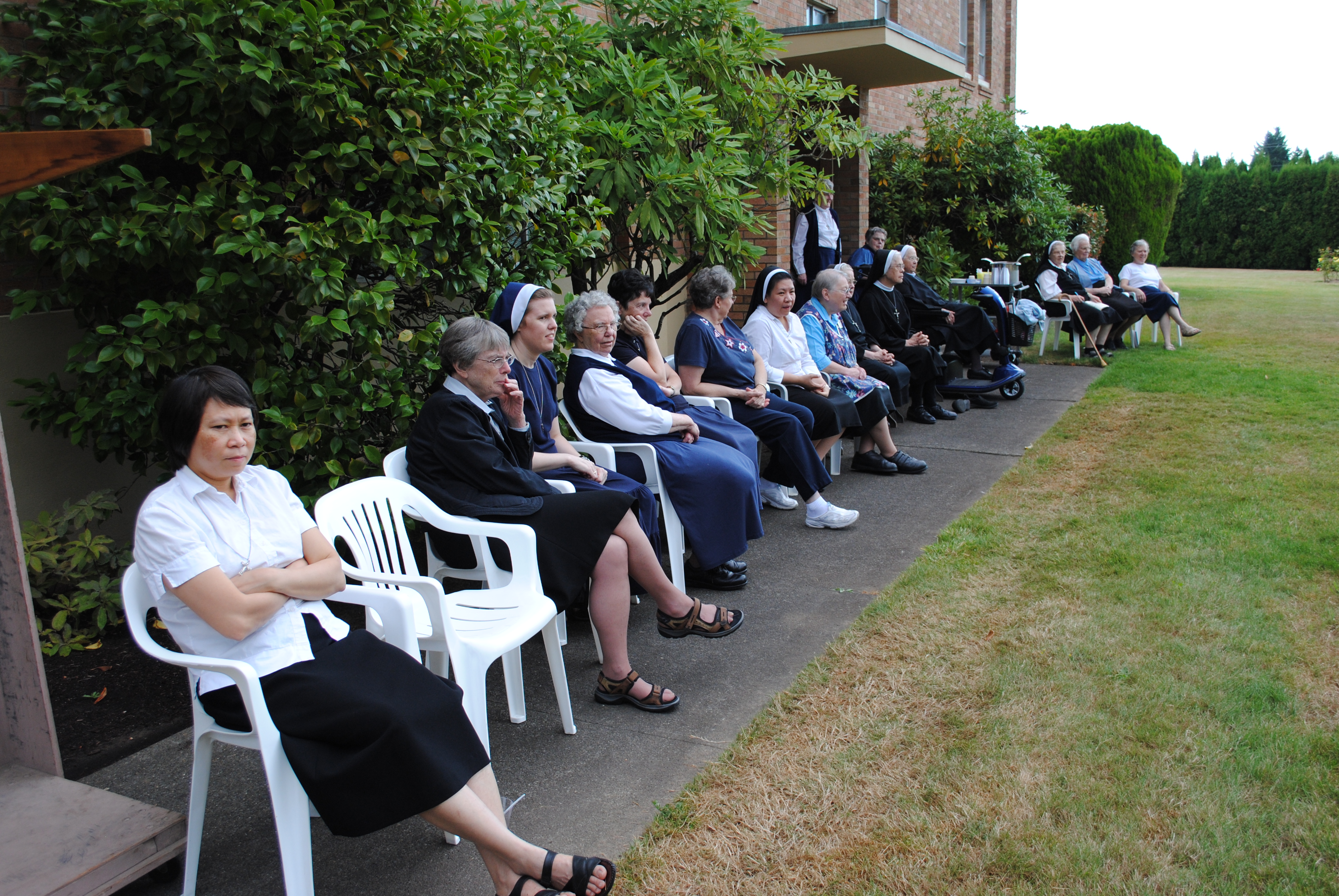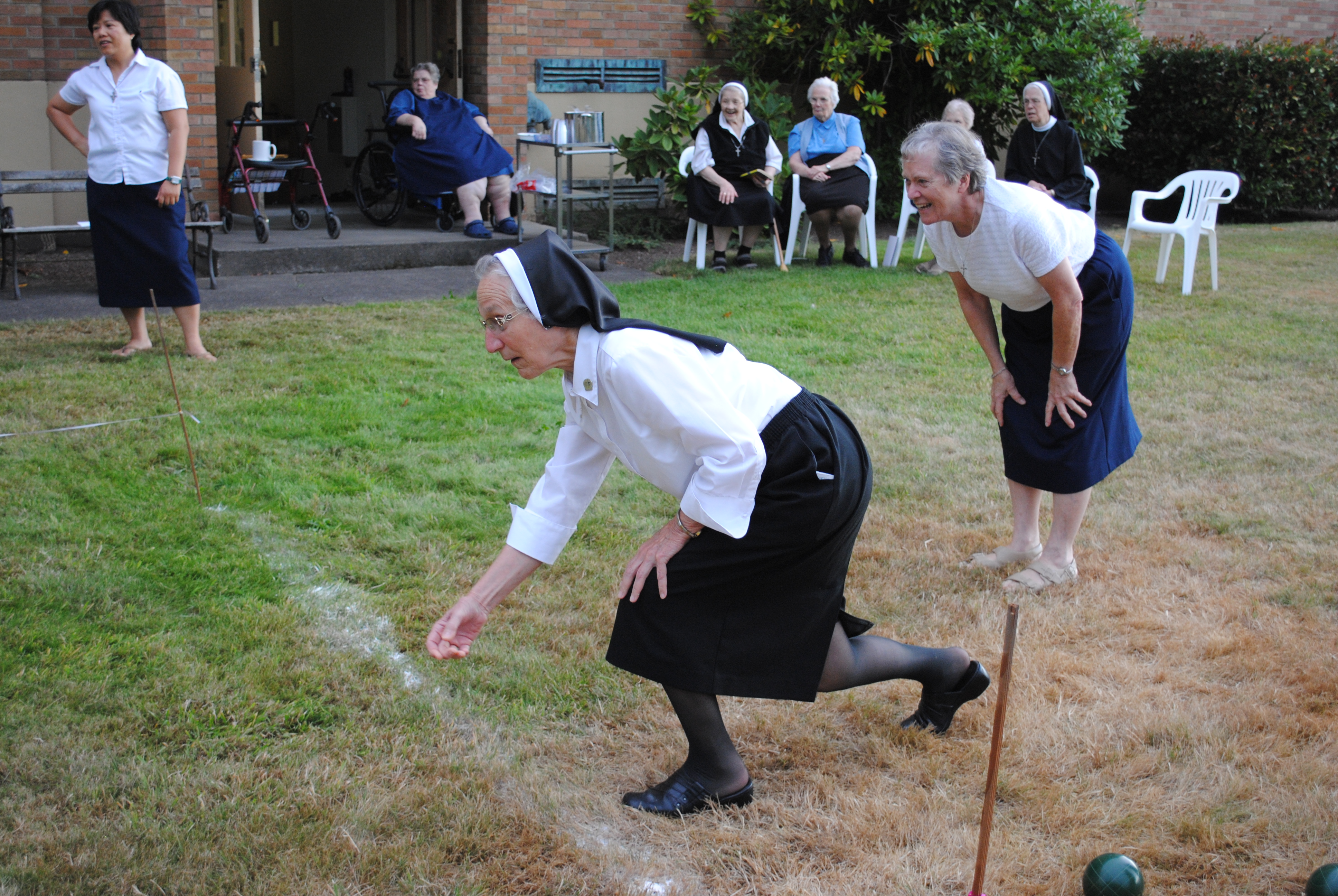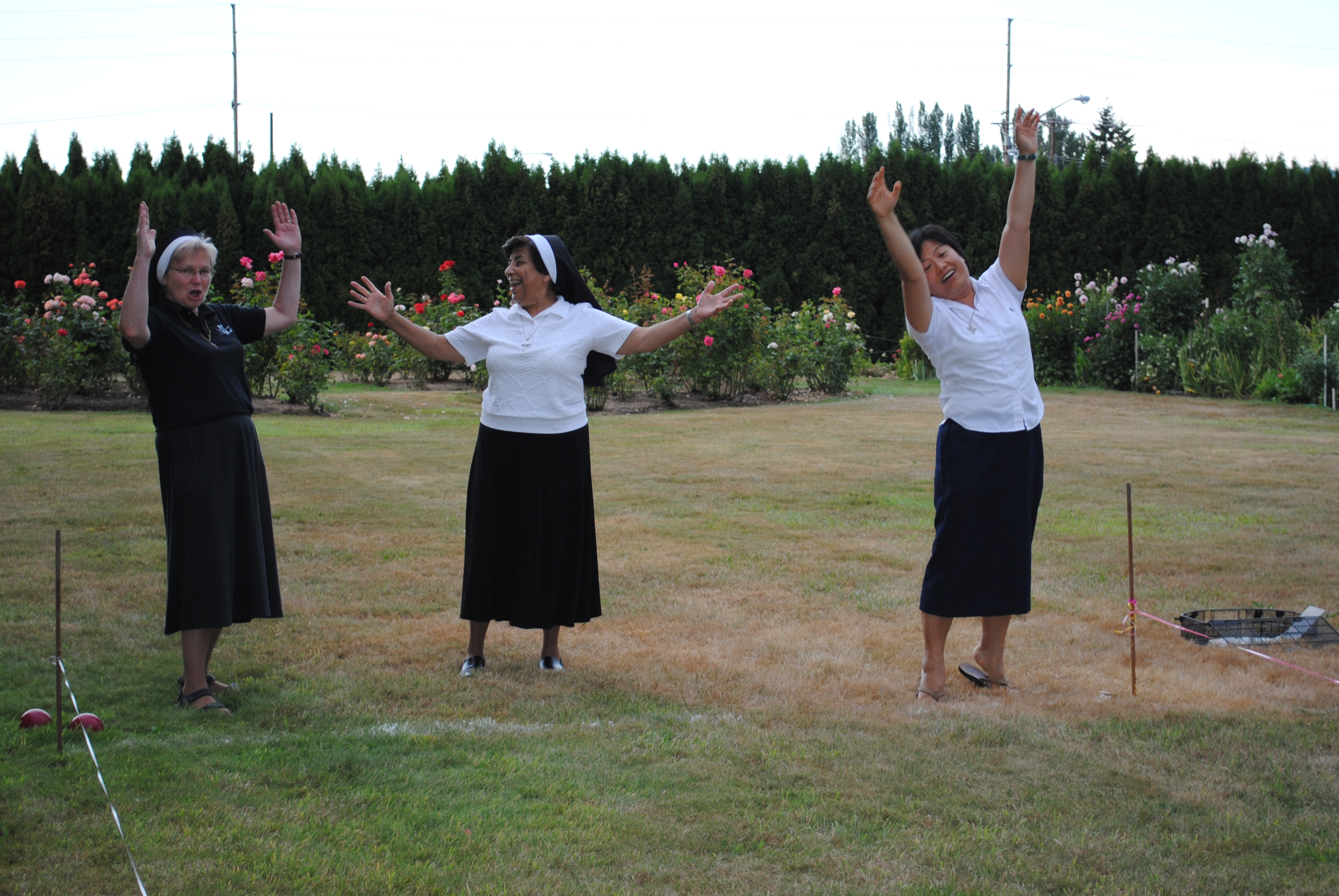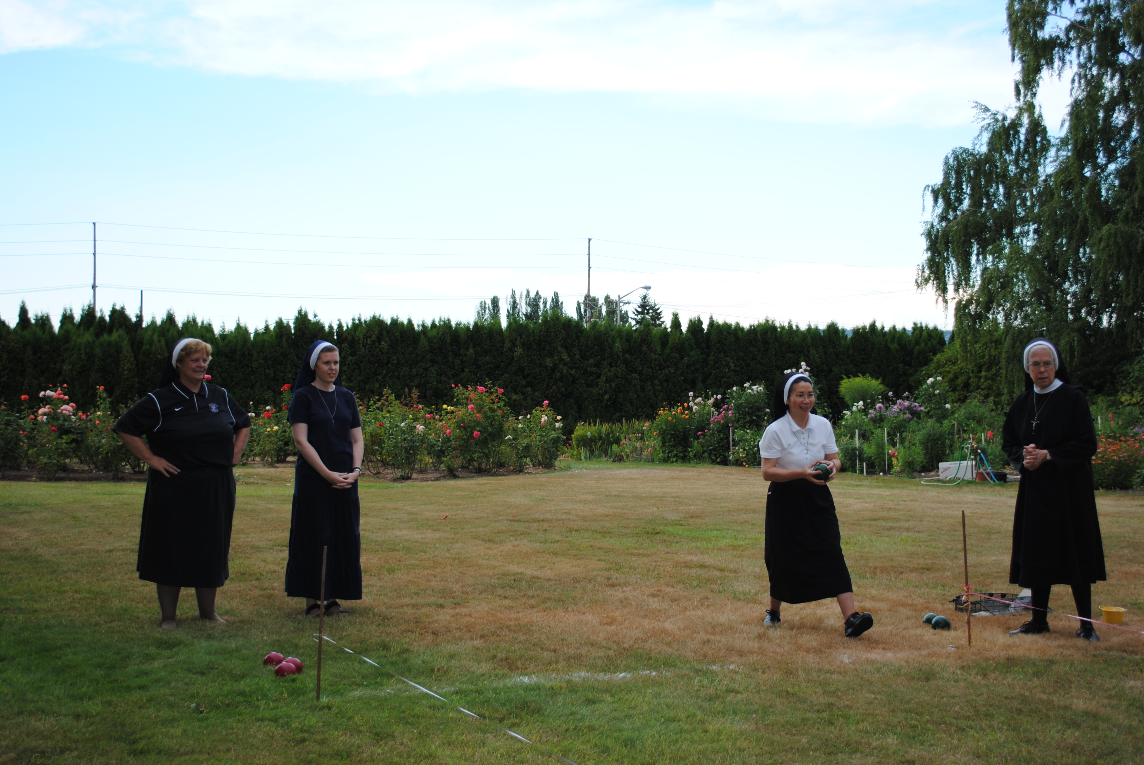 The Sisters of St. Mary of Oregon, at their annual “Community Days” took time out to compete in the Bocce Ball Tournament. Interestingly, this game was once the most popular game in the world! The basic aim of the game is to get your ball closest to the “jack” at the end of four balls per team. The game drew 18 contestants this year and a huge gallery of spectators! The champions, at the end of the double elimination tournament were Sister Juanita Villareal and Sister Michael Francine.