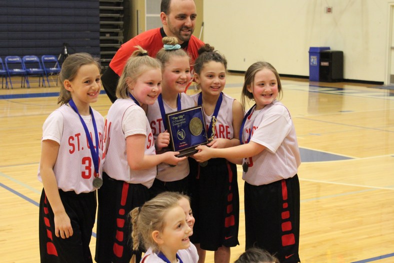 St. Clare: Sara, Sophia, Molly, Hadley, Sloan, Emery, Maeve, Addison.  Coaches: Derek Costarella, Jonathan Eames.  2017 CYO Third Grade Basketball Champions!